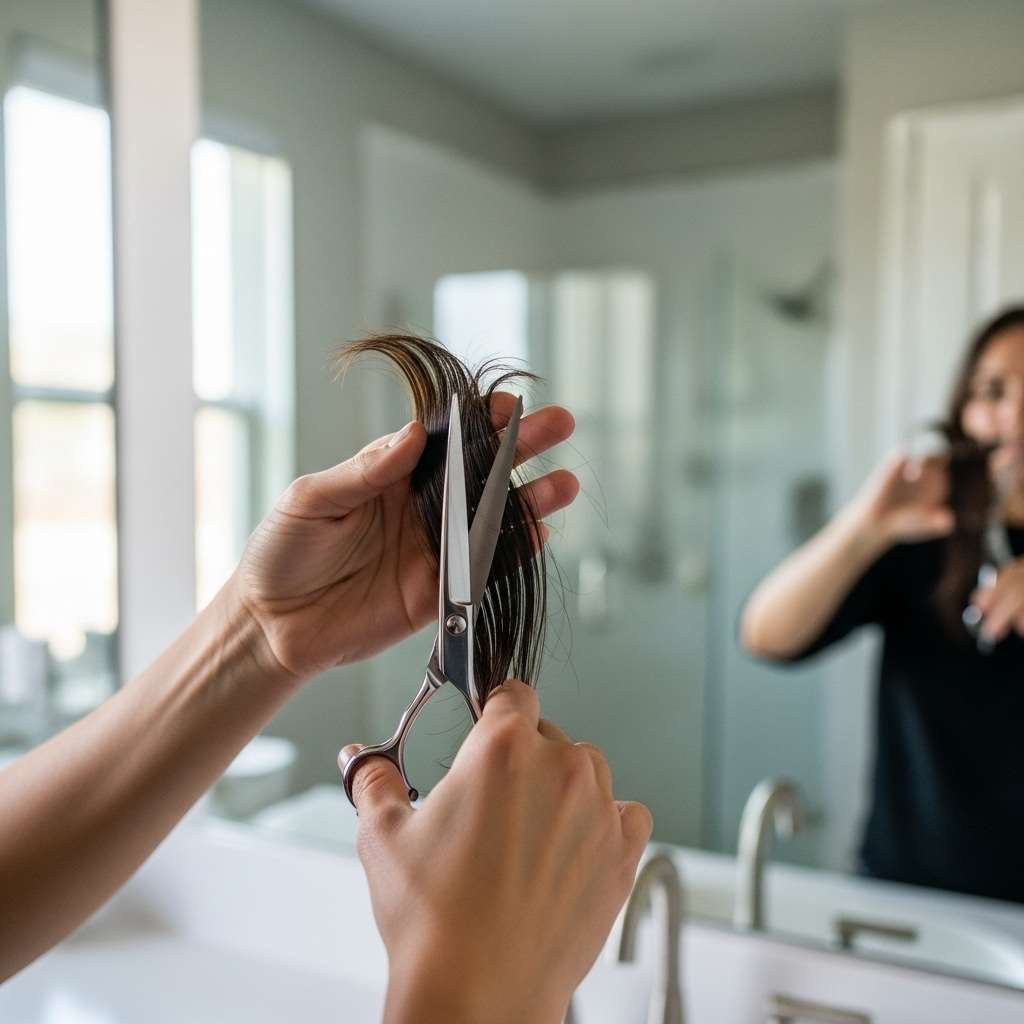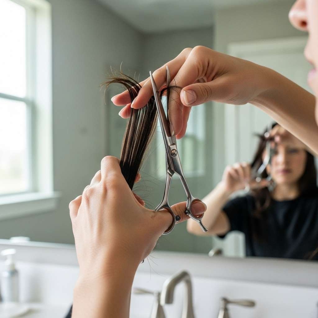 Lift hair upward with your fingers and trim only the tips for a cleaner, blended finish.